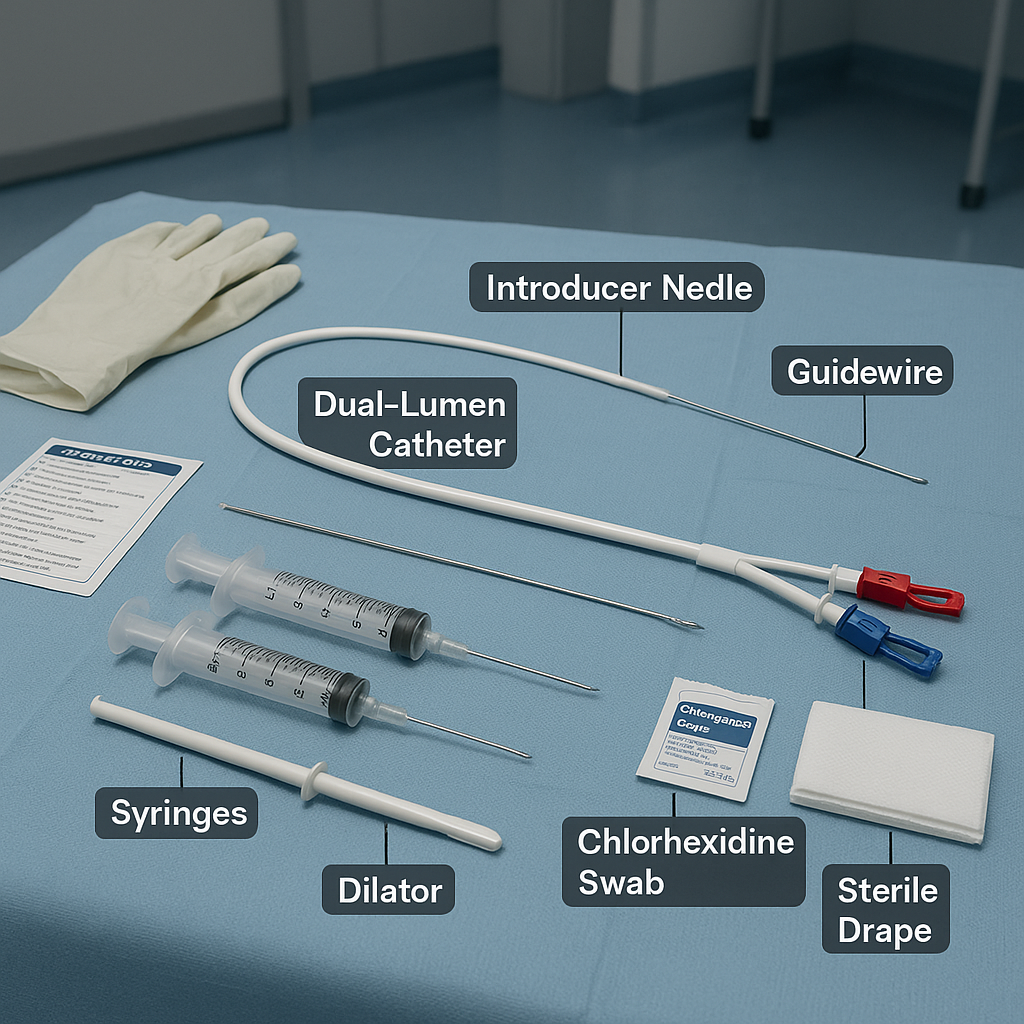 A short term hemodialysis catheter kit includes a variety of components that are designed to facilitate the smooth insertion and secure use of the catheter for short-term dialysis. The following key components are typically found in a short-term dialysis catheter kit: